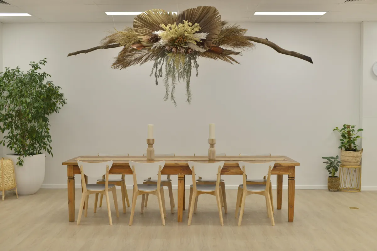 ✧ A magnificent 3-metre wooden table—perfect for masterminds, soul sessions, and sacred conversation